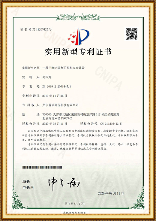 實用新型專利證書(一種甲醛清除劑的原料存儲