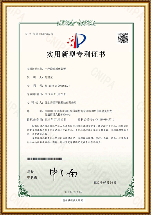 實用新型專利證書(一種除味循環(huán)裝置)